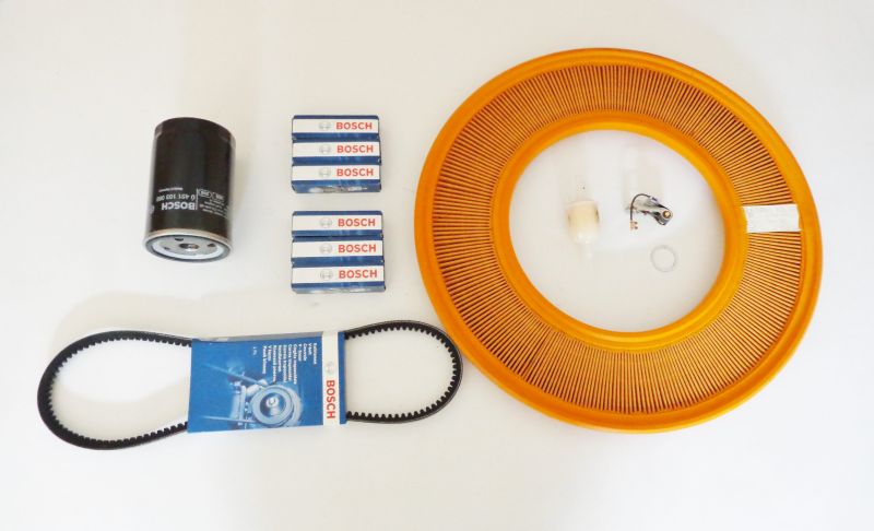 6x Zündkerze, 1x Luftfiltereinsatz, 1x Ölfilterpatrone, 1x Benzinfilter, 1x Keilriemen, 1x Kontaktsatz, 1x Dichtring für Ölablaßschraube